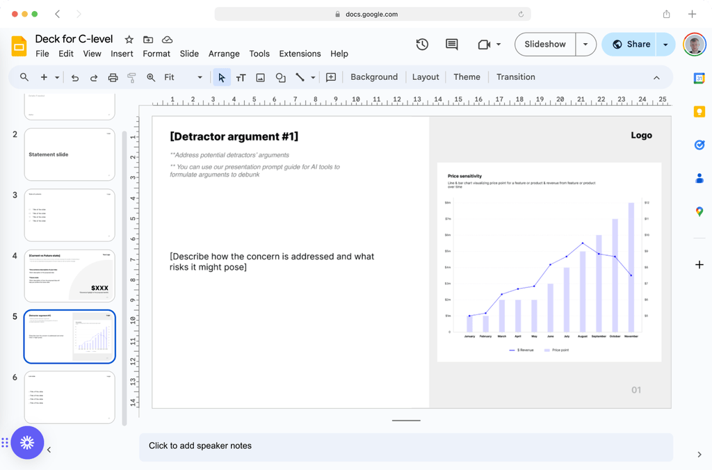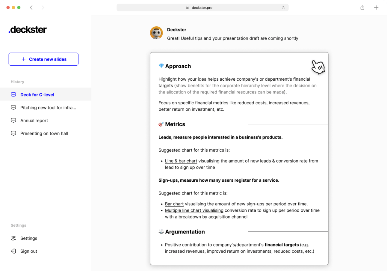 Google Slides draft: As an output, Deckster will generate a Google Slides draft with a tailored structure, content placeholders & tips.